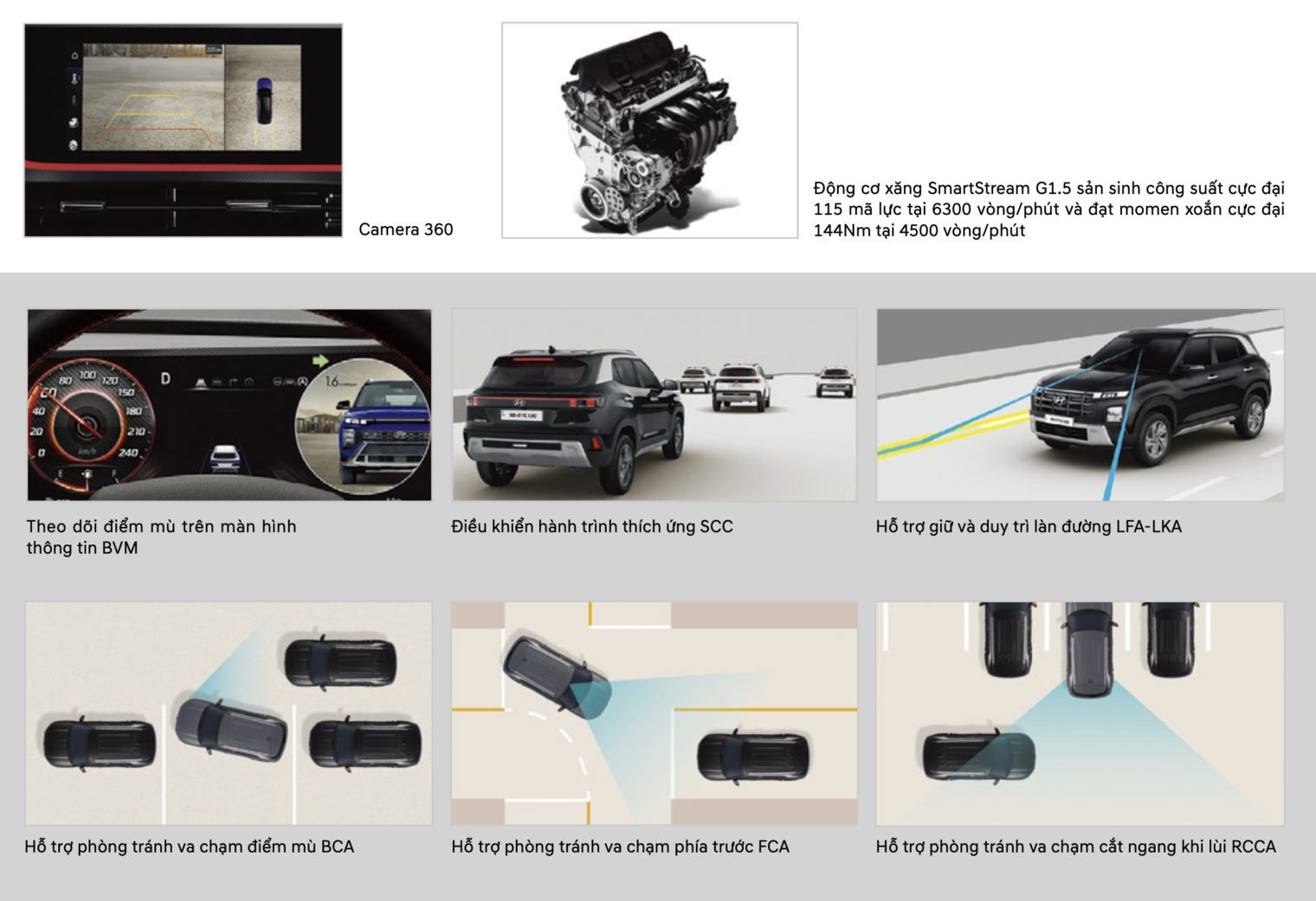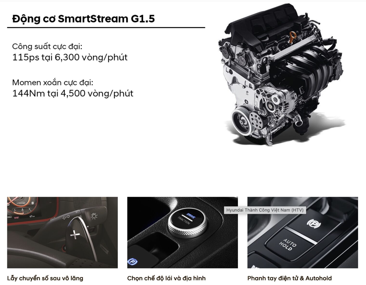 Hyundai Creta được phân phối tại Việt Nam trang bị động cơ xăng hút khí tự nhiên 1.5L mới sản sinh công suất 115 mã lực tại 6.300 vòng/phút, mô-men xoắn cực đại 144 Nm tại 4.500 vòng/phút.