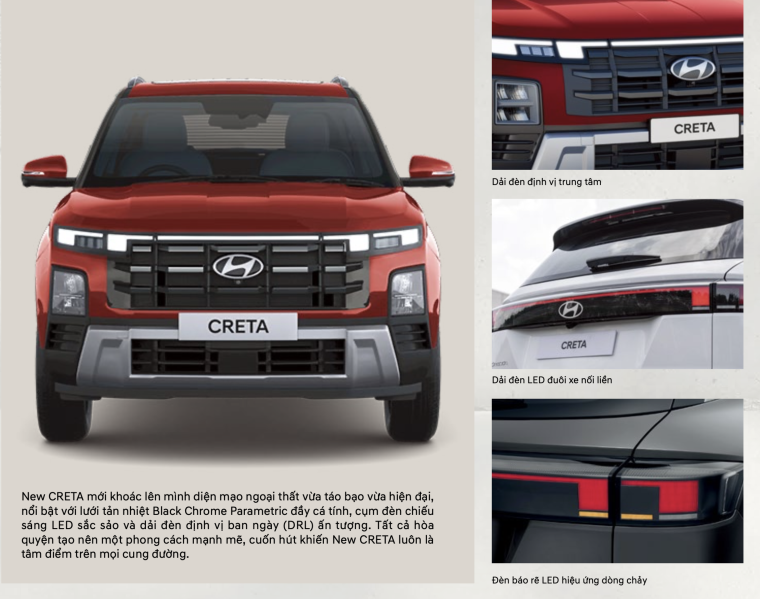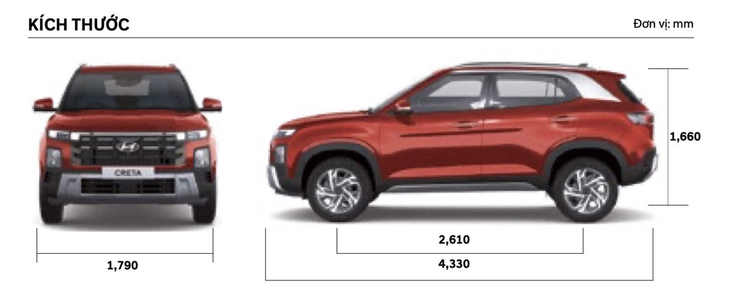 Hyundai Creta 2025 có kích thước Dài ( 4.315 mm ), Rộng (1.790 mm ), Cao (1.660 mm ) cùng khoảng sáng gầm xe gần như cao nhất phân khúc 200 (mm), được coi là “tiểu Tucson” với lưới tản nhiệt màu đen và đèn định vị LED nối liền bắt kịp xu hướng hiện nay của các mẫu xe hạng sang.